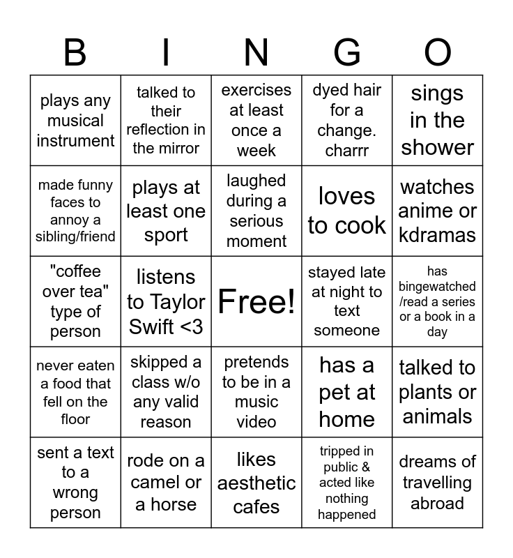 This bingo card has a free space and 24 words: skipped a class w/o any valid reason, rode on a camel or a horse, laughed during a serious moment, sent a text to a wrong person, sings in the shower, plays any musical instrument, made funny faces to annoy a sibling/friend, talked to their reflection in the mirror, stayed late at night to text someone, pretends to be in a music video, loves to cook, "coffee over tea" type of person, has a pet at home, talked to plants or animals, plays at least one sport, tripped in public & acted like nothing happened, has bingewatched /read a series or a book in a day, exercises at least once a week, watches anime or kdramas, listens to Taylor Swift <3, dreams of travelling abroad, never eaten a food that fell on the floor, dyed hair for a change. charrr and likes aesthetic cafes.