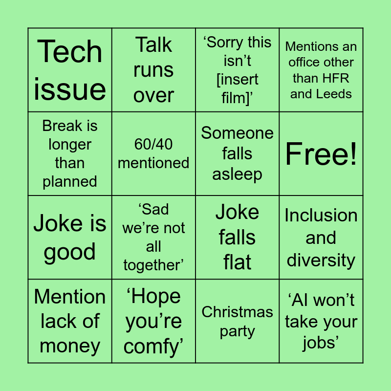 This bingo card has 18 words: ‘Sad we’re not all together’, ‘AI won’t take your jobs’, ‘Sorry this isn’t [insert film]’, Tech issue, Joke falls flat, Mentions an office other than HFR and Leeds, Mention lack of money, Talk runs over, Free!, Joke is good, Christmas party, Break is longer than planned, Inclusion and diversity, 60/40 mentioned, Someone falls asleep, ‘Can everyone hear me?’, ‘Hope you’re comfy’ and ‘We’ll just give it a couple more minutes before we start’.
