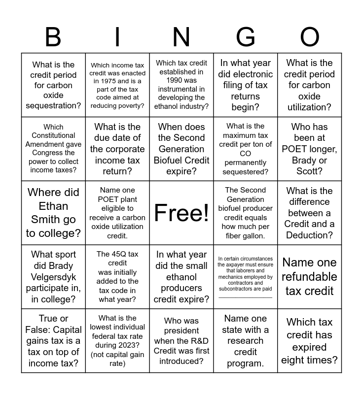 This bingo card has a free space and 50 words: In what year was the first R&D tax credit established in the United States?, Which tax credit has expired eight times?, Which tax legislation introduced the Clean Fuels Credit (45Z), Who was president when the R&D Credit was first introduced?, The 45Q tax credit was initially added to the tax code in what year?, Which president signed the Energy Improvement and Extension Act of 2008?, Which income tax credit was enacted in 1975 and is a part of the tax code aimed at reducing poverty?, From 1868 until 1913, 90 percent of all government revenue came from taxes on what?, Which Constitutional Amendment gave Congress the power to collect income taxes?, True or False: Value Share Bonuses get taxed at a different rate than regular wages., What is the due date of the corporate income tax return?, In what year did electronic filing of tax returns begin?, Name one refundable tax credit, In certain circumstances the axpayer must ensure that laborers and mechanics employed by contractors and subcontractors are paid ___________________, Tax credits tied to producing additional units are referred to as:, Tax credits tied to building or constructing an asset are referred to as:, When does the Second Generation Biofuel Credit expire?, The Second Generation biofuel producer credit equals how much per fiber gallon., Which tax credit requires pre-approval of a life cycle assessment from DOE and IRS?, What is the credit period for carbon oxide utilization?, Name one POET plant eligible to receive a carbon oxide utilization credit., Name one state with a research credit program., What is the credit period for carbon oxide sequestration?, What is the maximum tax credit per ton of CO permanently sequestered?, What is the maximum tax credit per gallon of Clean Fuel produced and sold in the United States?, True or False: Carbon Sequestration can enhance the 45Q and the 45Z credit?, Who has been at POET longer, Brady or Scott?, Which president signed the Inflation Reduction Act into law?, Which tax credit established in 1990 was instrumental in developing the ethanol industry?, In what year did the small ethanol producers credit expire?, Is Bonus Depreciation a tax credit?, When was the first year POET was a C Corporation?, Do fiber gallons sold outside the U.S. qualify for the Second Generation Biofuel Credit?, How many members of the tax team have a CPA license?, What is the lowest individual federal tax rate during 2023? (not capital gain rate), What is the highest individual federal tax rate during 2023?, What is the corporate federal tax rate during 2023?, True or False: All starch gallons are eligible for the Second Generation Biofuel Credit, Name one state that offers a refundable research credit, What is the difference between a Credit and a Deduction?, When does the Federal research credit expire?, When did POET claim its first Research Credit? (hint: it was not named POET at that time.), In the history of POET, in terms of qualified cost, what was the largest qualified research project at the company?, From 2016-2023, what is the single largest qualified research expense at POET? (Hint: options would be wages, 3rd party reseach, construction materials, corn, yeast, enzymes, utilities, lab supplies), True or False: Capital gains tax is a tax on top of income tax?, Where did Ethan Smith go to college?, Name the public accounting firm where both Meredith and Ethan worked prior to coming to POET., What sport did Scott LeBrun participate in, in college?, What sport did Brady Velgersdyk participate in, in college? and Which company's tax department did Kim Sucha of KPMG say is the best internal tax department she has ever worked with?.