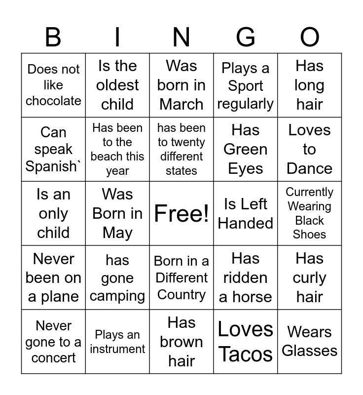 This bingo card has a free space and 24 words: Never gone to a concert, has gone camping, has been to twenty different states, Loves Tacos, Has long hair, Does not like chocolate, Is the oldest child, Was born in March, Is Left Handed, Currently Wearing Black Shoes, Is an only child, Has been to the beach this year, Has ridden a horse, Has curly hair, Can speak Spanish`, Plays an instrument, Has brown hair, Plays a Sport regularly, Loves to Dance, Never been on a plane, Was Born in May, Born in a Different Country, Has Green Eyes and Wears Glasses.