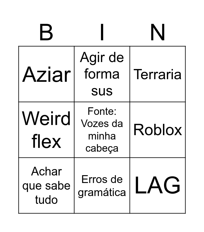 This bingo card has 12 words: Concordar com o PAUlo, LAG, Fonte: Vozes da minha cabeça, Roblox, Agir de forma sus, Terraria, Erros de gramática, Q word, Aziar, Weird flex, Achar que sabe tudo and Miguel ossos de boracha.