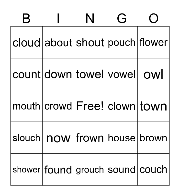 This bingo card has a free space and 24 words: now, found, towel, shower, flower, cloud, count, about, clown, frown, vowel, mouth, house, brown, down, sound, town, shout, owl, crowd, couch, slouch, pouch and grouch.