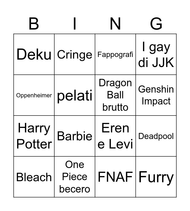 This bingo card has 16 words: One Piece becero, Deadpool, Fappografi, Deku, Harry Potter, Cringe, Eren e Levi, FNAF, Oppenheimer, pelati, Bleach, I gay di JJK, Barbie, Genshin Impact, Dragon Ball brutto and Furry.