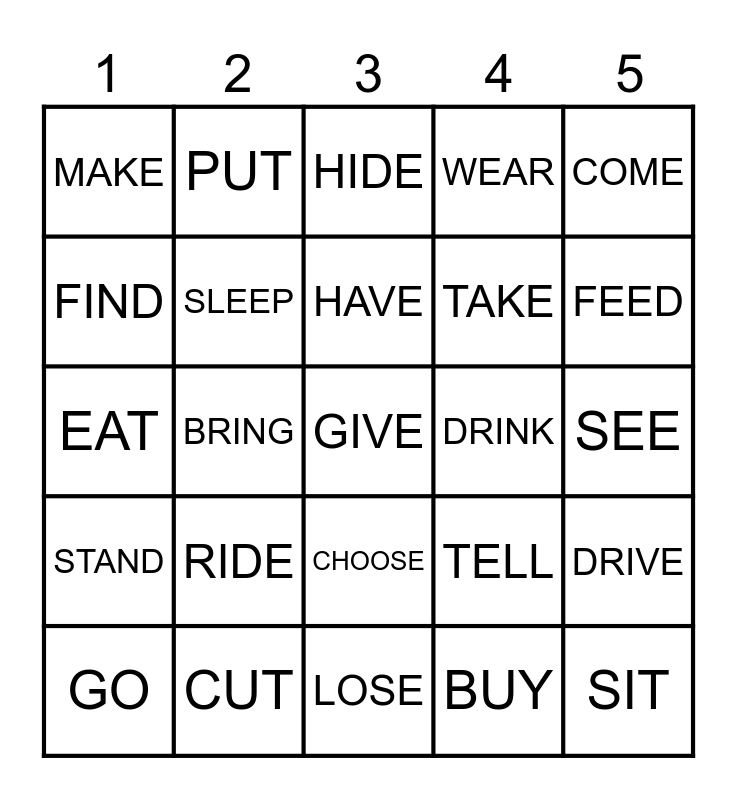 This bingo card has a free space and 24 words: RIDE, CUT, HAVE, GO, COME, MAKE, FIND, PUT, DRINK, CHOOSE, TAKE, EAT, TELL, DRIVE, SLEEP, BUY, SEE, HIDE, FEED, BRING, SIT, STAND, WEAR and LOSE.