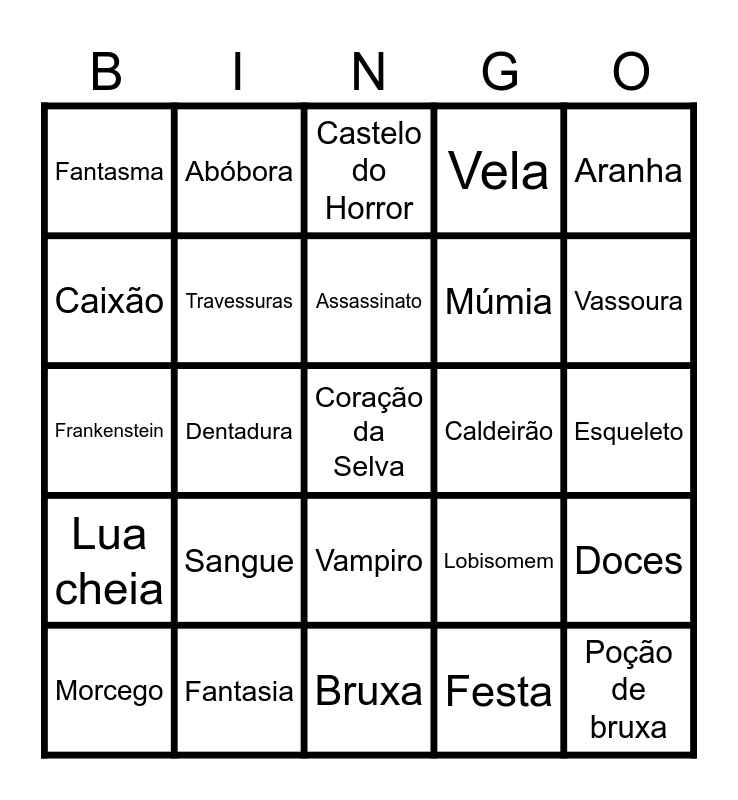 This bingo card has 25 words: Sangue, Bruxa, Assassinato, Morcego, Aranha, Fantasma, Caixão, Abóbora, Caldeirão, Vampiro, Múmia, Frankenstein, Lobisomem, Doces, Travessuras, Poção de bruxa, Esqueleto, Castelo do Horror, Vassoura, Dentadura, Coração da Selva, Fantasia, Lua cheia, Vela and Festa.
