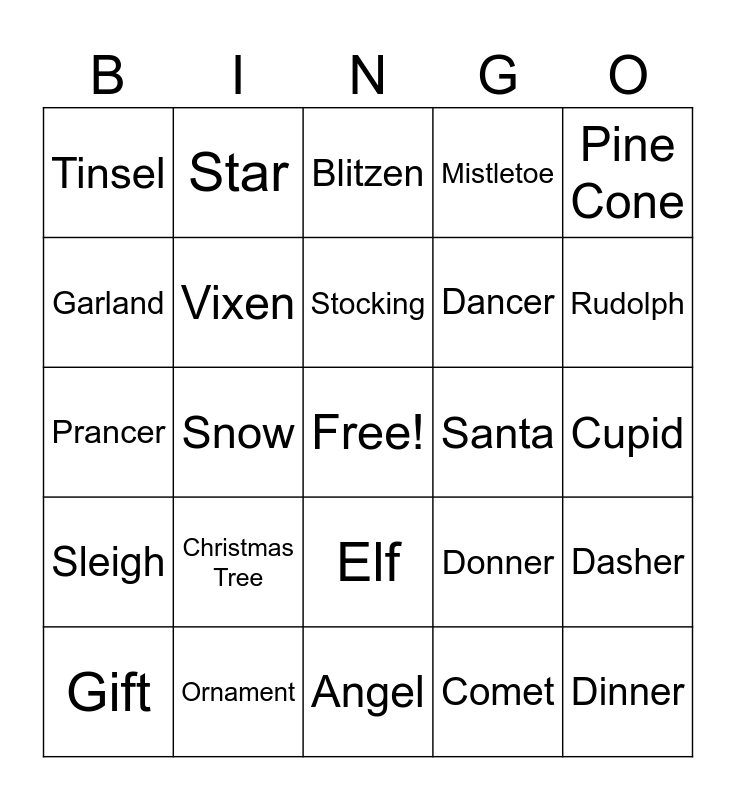 This bingo card has a free space and 24 words: Christmas Tree, Ornament, Stocking, Gift, Pine Cone, Tinsel, Garland, Star, Santa, Elf, Dancer, Prancer, Donner, Dasher, Vixen, Comet, Cupid, Blitzen, Rudolph, Snow, Dinner, Sleigh, Mistletoe and Angel.