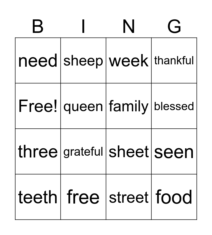 This bingo card has 16 words: free, seen, week, need, three, sheep, sheet, street, Free!, queen, teeth, thankful, grateful, blessed, family and food.