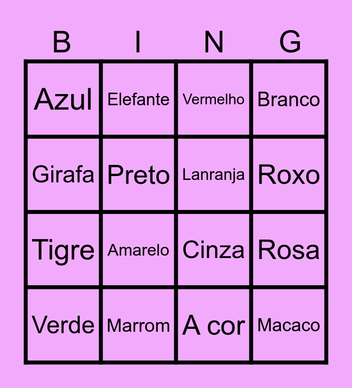 This bingo card has 17 words: A cor, Verde, Vermelho, Azul, Amarelo, Branco, Rosa, Lanranja, Roxo, Preto, Marrom, Cinza, Girafa, Elefante, Tigre, Leão and Macaco.