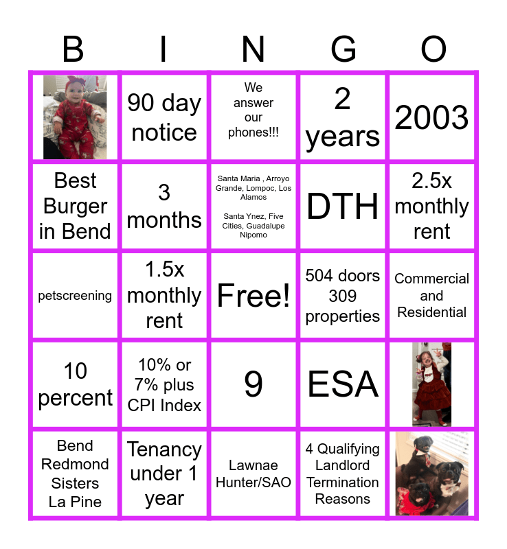 This bingo card has 3 images, a free space and 21 words: 10% or 7% plus CPI Index, Tenancy under 1 year, Santa Maria , Arroyo Grande, Lompoc, Los Alamos Santa Ynez, Five Cities, Guadalupe Nipomo, Bend Redmond Sisters La Pine, 2003, Best Burger in Bend, 90 day notice, 504 doors 309 properties, 9, DTH, petscreening, ESA, 3 months, 4 Qualifying Landlord Termination Reasons, Commercial and Residential, We answer our phones!!!, 2.5x monthly rent, 1.5x monthly rent, 10 percent, 2 years and Lawnae Hunter/SAO.