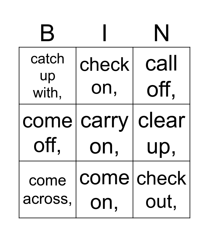 This bingo card has 19 words: Free!, call in,, call off,, call on,, care for,, carry on,, catch on,, catch up with,, check on,, check out,, clear away,, clear up,, come across,, come along,, come down,, come down with,, come off,, come on, and come up,.