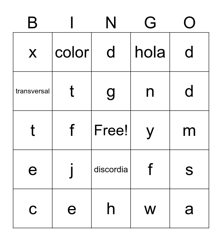 This bingo card has a free space and 29 words: e, e, d, q, d, x, t, g, y, s, c, f, w, a, t, y, h, f, d, e, j, b, n, m, transversal, color, discordia, hola and como.