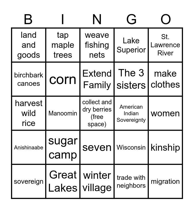 This bingo card has a free space and 44 words: wigwam, migration, alliance, sovereign, human capitol, trade with neighbors, weave fishing nets, East Coast, St. Lawrence River, Great Lakes, Lake Superior, American Indian Sovereignty, seven, sugar camp, near rivers and lakes, winter village, ponds and marshes, harvest wild rice, hunt and trap game, make clothes, tap maple trees, build canoes, food on the water, land and goods, men, women, Dakota, Ojibwe, Wisconsin, Anishinaabe, Tipi, kinship, generosity, oral tradition, Manoomin, story telling, Seasonal Round, Respect, Extend Family, birchbark canoes, The 3 sisters, squash, corn and beans.