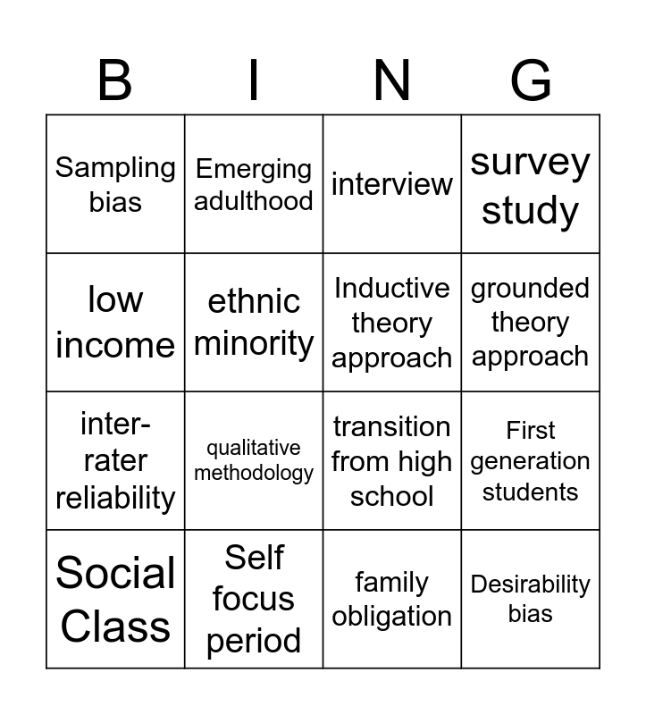 This bingo card has 16 words: Self focus period, First generation students, interview, Sampling bias, inter-rater reliability, Emerging adulthood, transition from high school, family obligation, low income, ethnic minority, Social Class, survey study, qualitative methodology, grounded theory approach, Inductive theory approach and Desirability bias.