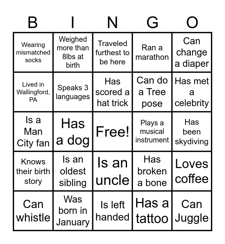 This bingo card has a free space and 24 words: Can whistle, Is an oldest sibling, Has scored a hat trick, Has a tattoo, Can change a diaper, Wearing mismatched socks, Weighed more than 8lbs at birth, Traveled furthest to be here, Plays a musical instrument, Has been skydiving, Is a Man City fan, Speaks 3 languages, Has broken a bone, Loves coffee, Lived in Wallingford, PA, Was born in January, Is left handed, Ran a marathon, Has met a celebrity, Knows their birth story, Has a dog, Is an uncle, Can do a Tree pose and Can Juggle.