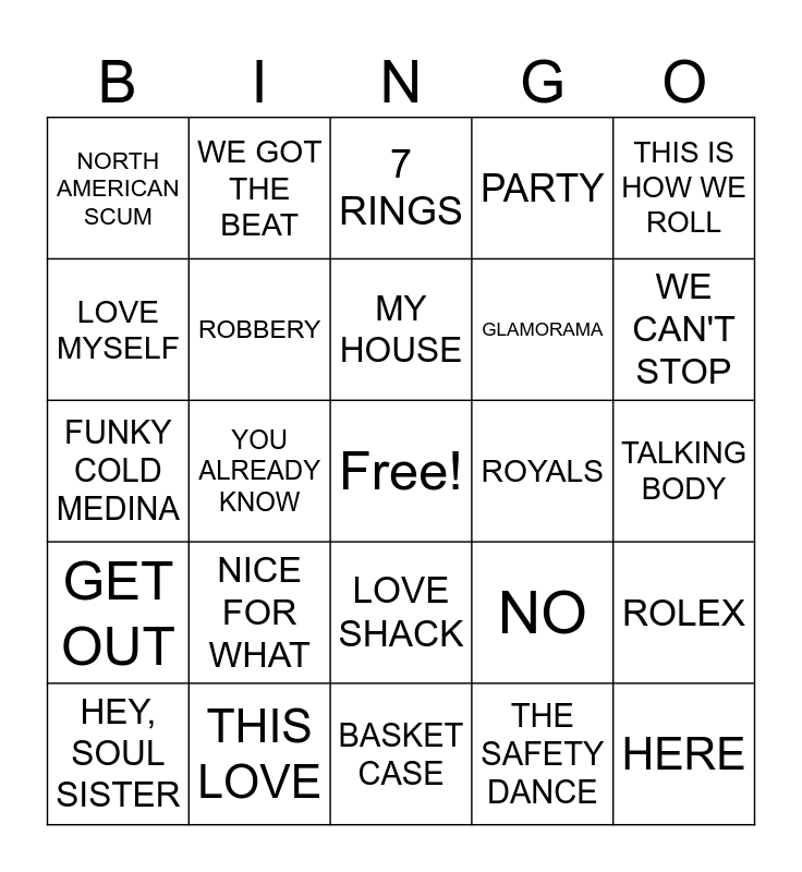 This bingo card has a free space and 38 words: ALL NIGHT LONG, ACHY BREAKY HEART, GET BY, ROBBERY, ROLEX, NICE FOR WHAT, MY HOUSE, PANDA, THIS IS HOW WE ROLL, GLAMORAMA, YOU ALREADY KNOW, PARTY, HERE, TALKING BODY, LOVE MYSELF, GET OUT, I LIKE IT, 7 RINGS, PAPARAZZI, ROYALS, NORTH AMERICAN SCUM, THIS LOVE, WE CAN'T STOP, HEY, SOUL SISTER, DARK HORSE, BASKET CASE, GIRL ALL THE BAD GUYS WANT, HUNGRY LIKE THE WOLF, KICKSTART MY HEART, I WANNA ROCK, HOLIDAY, LOVE SHACK, THE SAFETY DANCE, WE GOT THE BEAT, CHEERLEADER, NO, FUNKY COLD MEDINA and SHE HATES ME.