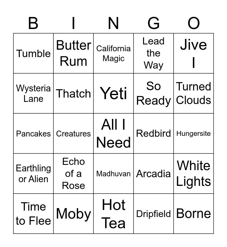This bingo card has 25 words: Echo of a Rose, Hot Tea, Yeti, Time to Flee, Jive I, Tumble, Wysteria Lane, Butter Rum, Redbird, Madhuvan, So Ready, Pancakes, Arcadia, White Lights, Thatch, Borne, Hungersite, California Magic, Turned Clouds, Creatures, All I Need, Moby, Earthling or Alien, Lead the Way and Dripfield.