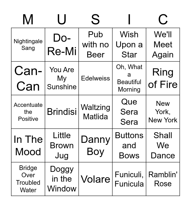 This bingo card has 30 words: Doggy in the Window, Music, Music, Music, Brindisi, Imagine, Nightingale Sang, Pub with no Beer, You Are My Sunshine, Danny Boy, Que Sera Sera, Volare, New York, New York, Waltzing Matlida, Funiculi, Funicula, Ramblin' Rose, Ring of Fire, Sweet Caroline, Buttons and Bows, In The Mood, Little Brown Jug, We'll Meet Again, Accentuate the Positive, Pistol Packin' Mama, Do-Re-Mi, Oh, What a Beautiful Morning, Can-Can, Wish Upon a Star, Shall We Dance, Bridge Over Troubled Water, Edelweiss and Home Among the Gum Trees.