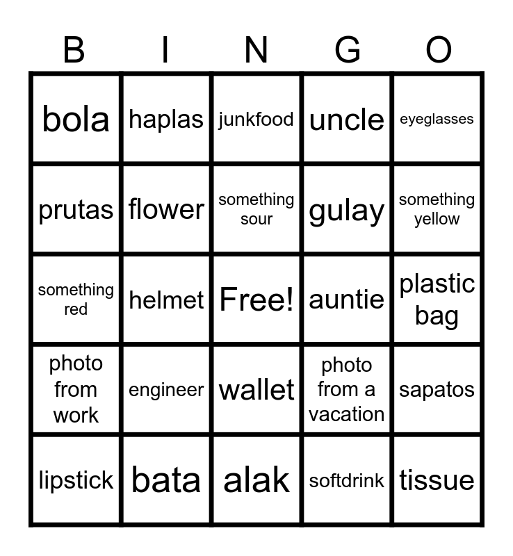 This bingo card has a free space and 45 words: p500 bill, tissue, rubber band, lipstick, spoon, softdrink, junkfood, fork, eyeglasses, bata, uncle, auntie, wallet, engineer, artwork, alak, chocolate, something red, something green, something yellow, haplas, plato, baso, bola, paper bag, plastic bag, karton, puthaw, photo from a vacation, photo from work, photo with family, sapatos, payong, relo, papel, helmet, bukog, mananap, tela, something sour, prutas, gulay, listahan, flower and phone cover.