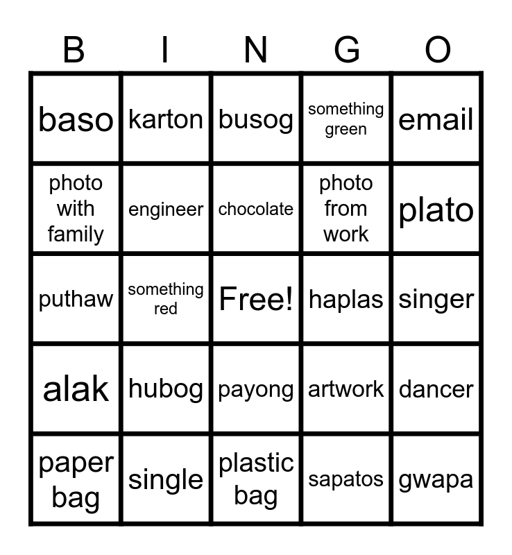 This bingo card has a free space and 36 words: selfie with lolo, selfie with lola, wallet, engineer, artwork, alak, chocolate, water, email, tambal, something red, something green, something yellow, haplas, plato, baso, bola, hubog, gwapa, busog, singer, dancer, single, paper bag, plastic bag, karton, puthaw, photo from a vacation, photo from work, photo with family, skincare, tsinelas, sapatos, payong, relo and papel.