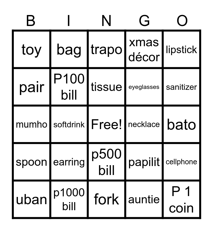 This bingo card has a free space and 41 words: candy, mumho, toothpick, P100 bill, p1000 bill, p500 bill, tissue, rubber band, lipstick, spoon, softdrink, xmas décor, P 1 coin, bato, necklace, earring, ring, toy, panyo, trapo, cellphone, junkfood, fork, eyeglasses, bata, uncle, auntie, paypay, sanitizer, brown leaf, something gold, bag, uban, lisensya, papilit, pair, liston, imported, band-aid, lip balm and samad.