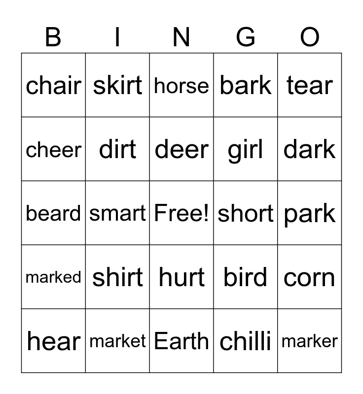 This bingo card has a free space and 25 words: shirt, Earth, deer, hear, tear, chair, cheer, skirt, short, hurt, girl, beard, bird, corn, dirt, near, park, horse, dark, smart, marker, market, marked, bark and chilli.