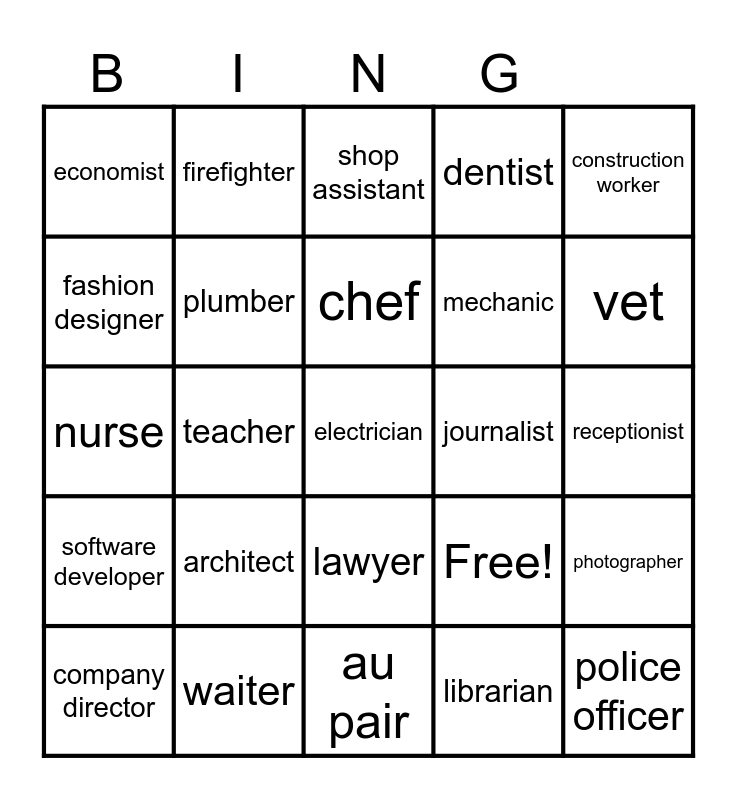 This bingo card has 25 words: architect, au pair, chef, company director, construction worker, economist, fashion designer, firefighter, journalist, lawyer, mechanic, nurse, Free!, photographer, plumber, police officer, receptionist, shop assistant, vet, teacher, electrician, waiter, software developer, dentist and librarian.