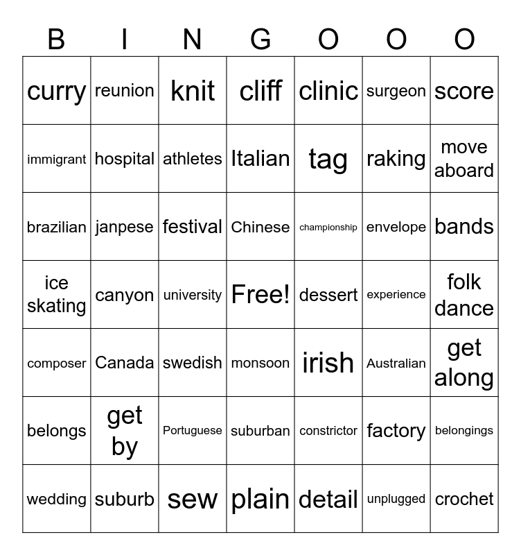 This bingo card has a free space and 48 words: constrictor, raking, plain, canyon, festival, folk dance, reunion, suburb, surgeon, monsoon, score, cliff, envelope, championship, belongs, experience, immigrant, move aboard, factory, clinic, tag, university, curry, hospital, belongings, athletes, bands, wedding, Chinese, janpese, unplugged, dessert, get along, get by, ice skating, irish, Australian, brazilian, swedish, Portuguese, composer, crochet, knit, sew, Italian, suburban, Canada and detail.