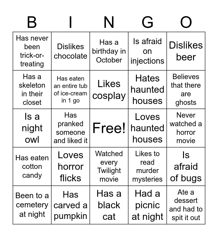 This bingo card has a free space and 24 words: Loves horror flicks, Has carved a pumpkin, Likes cosplay, Been to a cemetery at night, Dislikes beer, Has never been trick-or-treating, Has a skeleton in their closet, Dislikes chocolate, Loves haunted houses, Watched every Twilight movie, Hates haunted houses, Is a night owl, Likes to read murder mysteries, Is afraid of bugs, Has eaten an entire tub of ice-cream in 1 go, Had a picnic at night, Never watched a horror movie, Has a birthday in October, Believes that there are ghosts, Has pranked someone and liked it, Ate a dessert and had to spit it out, Has eaten cotton candy, Is afraid on injections and Has a black cat.