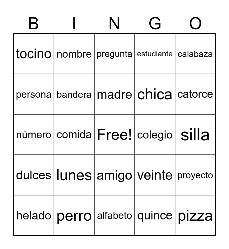 This bingo card has a free space and 29 words: gato, perro, pregunta, mascota, calabaza, tocino, bandera, madre, colegio, proyecto, helado, comida, quince, pizza, número, color, alfabeto, veinte, catorce, dulces, lunes, suerte, chica, silla, persona, nombre, amigo, estudiante and profesor.