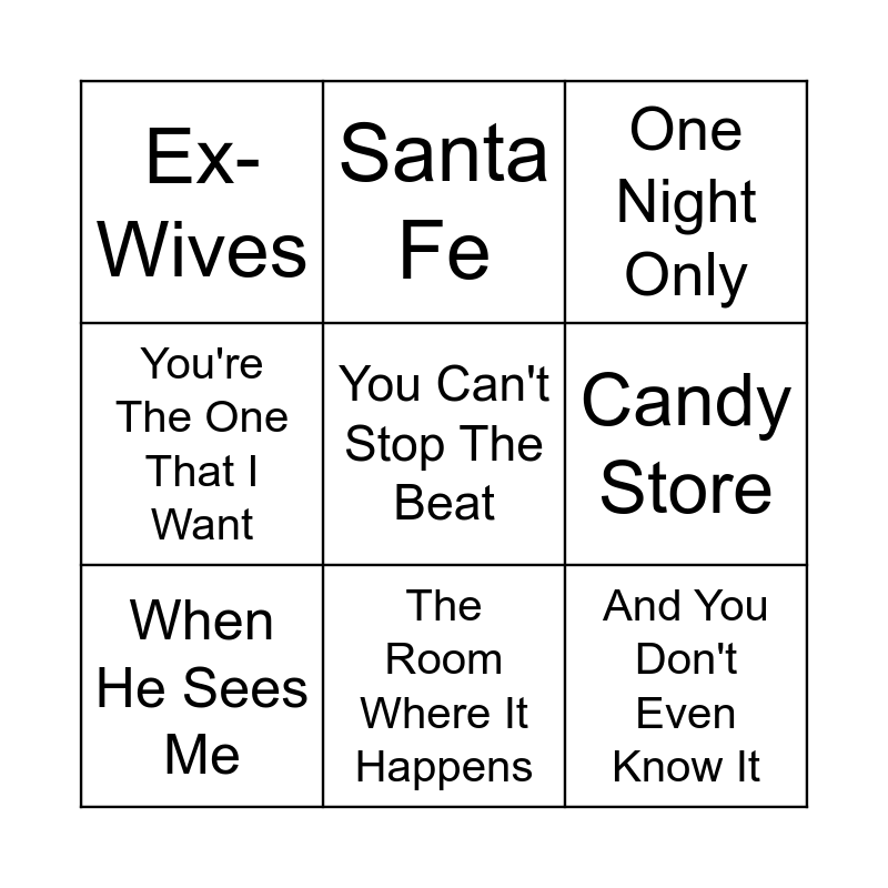 This bingo card has a free space and 15 words: Revolting Children, Defying Gravity, One Night Only, Ex-Wives, The Room Where It Happens, And You Don't Even Know It, You Will Be Found, Another Day of Sun, Candy Store, Welcome To The Moulin Rouge, Cell Block Tango, You're The One That I Want, When He Sees Me, Santa Fe and The Greatest Show.