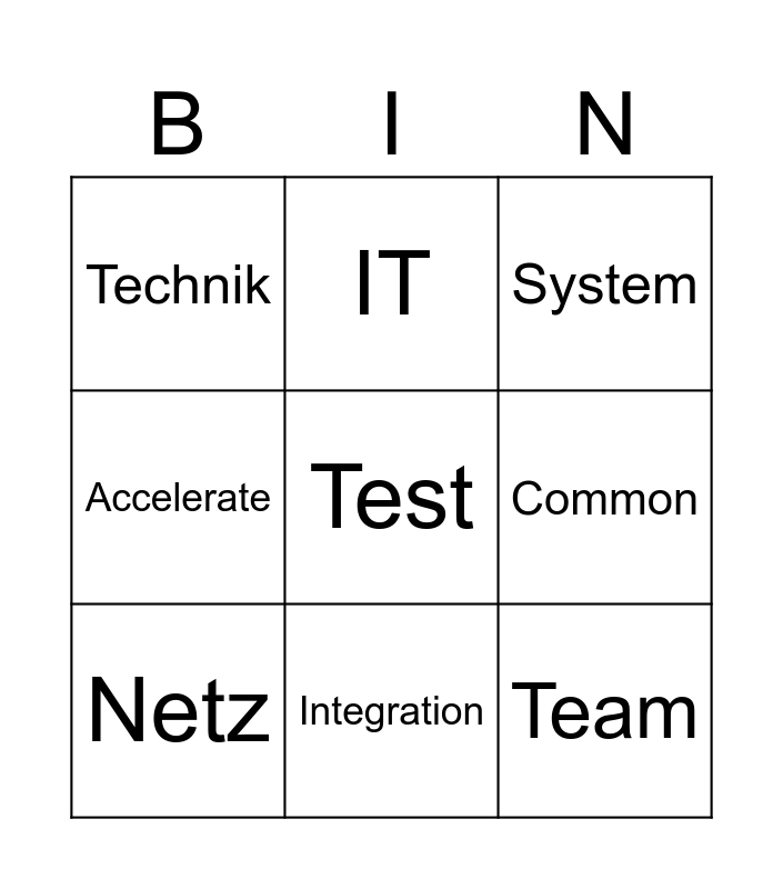 This bingo card has a free space and 8 words: Common, System, IT, Netz, Technik, Team, Accelerate and Integration.