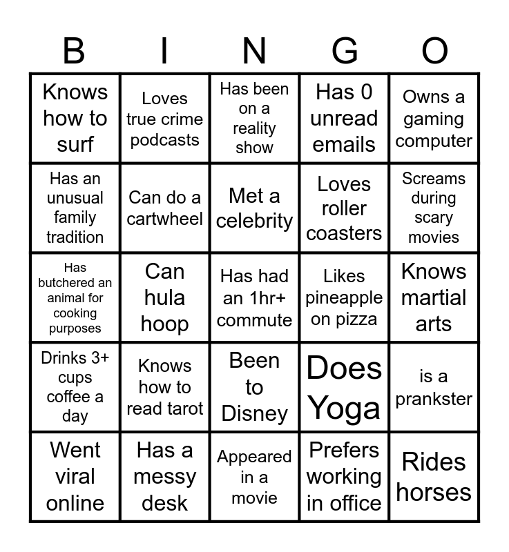 This bingo card has 25 words: Knows how to read tarot, Appeared in a movie, Met a celebrity, Went viral online, Owns a gaming computer, Knows how to surf, Has an unusual family tradition, Loves true crime podcasts, Likes pineapple on pizza, Been to Disney, Loves roller coasters, Has butchered an animal for cooking purposes, Does Yoga, is a prankster, Can do a cartwheel, Rides horses, Knows martial arts, Has been on a reality show, Screams during scary movies, Can hula hoop, Has had an 1hr+ commute, Has a messy desk, Drinks 3+ cups coffee a day, Has 0 unread emails and Prefers working in office.