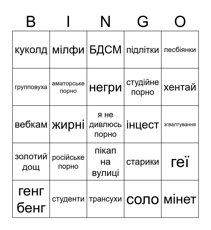 This bingo card has a free space and 24 words: російське порно, студенти, негри, генг бенг, лесбіянки, куколд, групповуха, мілфи, інцест, пікап на вулиці, студійне порно, вебкам, старики, геї, аматорське порно, соло, згвалтування, БДСМ, хентай, жирні, мінет, золотий дощ, підлітки and трансухи.