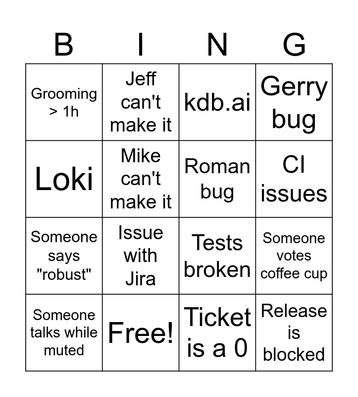 This bingo card has 22 words: Free!, Peter-ism, Jeff can't make it, Joel can't make it, Mike can't make it, Roman bug, Grooming > 1h, kdb.ai, Tests broken, Release is blocked, Someone says "robust", Gerry bug, Meeting starts > 2 min late, Ticket rejected, Ticket is a 0, Ticket is an infinity, Someone votes coffee cup, Someone talks while muted, Issue with Jira, Loki, CI issues and UX.
