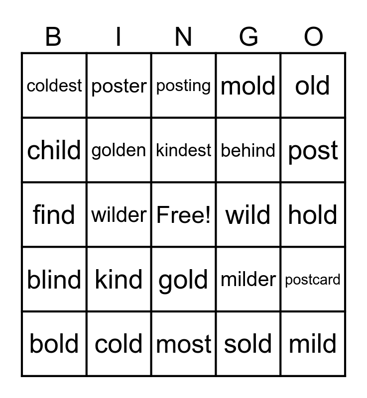 This bingo card has a free space and 25 words: kind, most, kindest, bold, old, coldest, child, poster, wild, gold, behind, find, milder, postcard, golden, holding, hold, posting, post, wilder, mild, cold, blind, mold and sold.