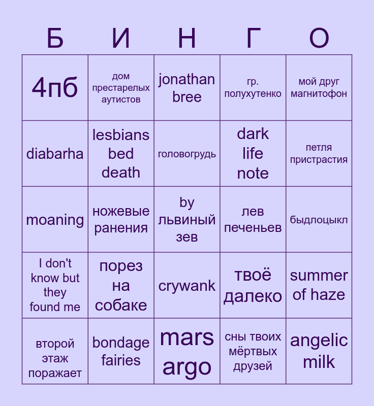 This bingo card has a free space and 24 words: порез на собаке, bondage fairies, головогрудь, второй этаж поражает, мой друг магнитофон, 4пб, diabarha, дом престарелых аутистов, лев печеньев, crywank, dark life note, moaning, твоё далеко, summer of haze, lesbians bed death, сны твоих мёртвых друзей, быдлоцыкл, jonathan bree, петля пристрастия, ножевые ранения, angelic milk, I don't know but they found me, гр. полухутенко and mars argo.
