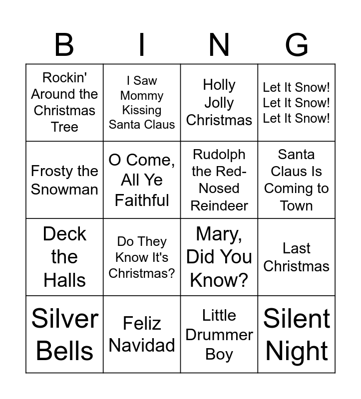 This bingo card has 36 words: Free!, Jingle Bells, White Christmas, Rudolph the Red-Nosed Reindeer, All I Want for Christmas Is You, Silent Night, Santa Claus Is Coming to Town, Winter Wonderland, Frosty the Snowman, The Christmas Song (Chestnuts Roasting on an Open Fire), Last Christmas, Let It Snow! Let It Snow! Let It Snow!, O Holy Night, Feliz Navidad, Do They Know It's Christmas?, Rockin' Around the Christmas Tree, It's Beginning to Look a Lot Like Christmas, Carol of the Bells, Silver Bells, Holly Jolly Christmas, Little Drummer Boy, Have Yourself a Merry Little Christmas, Wonderful Christmastime, Blue Christmas, Grandma Got Run Over by a Reindeer, I Saw Mommy Kissing Santa Claus, Mary, Did You Know?, Christmas (Baby Please Come Home), Deck the Halls, O Come, All Ye Faithful, Here Comes Santa Claus, The First Noel, I'll Be Home for Christmas, Silver and Gold, Up on the Housetop and Let There Be Peace on Earth.