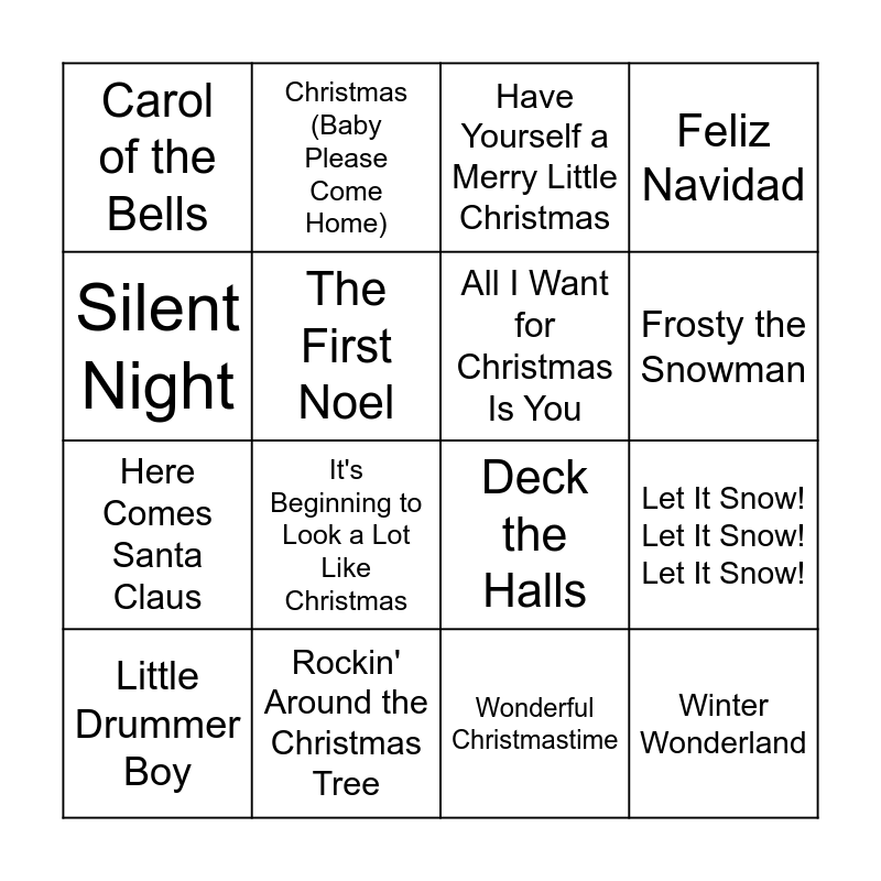 This bingo card has 36 words: Jingle Bells, White Christmas, Rudolph the Red-Nosed Reindeer, All I Want for Christmas Is You, Santa Claus Is Coming to Town, Winter Wonderland, Frosty the Snowman, The Christmas Song (Chestnuts Roasting on an Open Fire), Silent Night, Last Christmas, Let It Snow! Let It Snow! Let It Snow!, Feliz Navidad, Do They Know It's Christmas?, Rockin' Around the Christmas Tree, It's Beginning to Look a Lot Like Christmas, Carol of the Bells, Silver Bells, Holly Jolly Christmas, Little Drummer Boy, Have Yourself a Merry Little Christmas, Wonderful Christmastime, Blue Christmas, Grandma Got Run Over by a Reindeer, I Saw Mommy Kissing Santa Claus, Mary, Did You Know?, Christmas (Baby Please Come Home), Deck the Halls, O Come, All Ye Faithful, Here Comes Santa Claus, The First Noel, I'll Be Home for Christmas, Silver and Gold, Up on the Housetop, Let There Be Peace on Earth, Santa Baby and Sleigh Ride.
