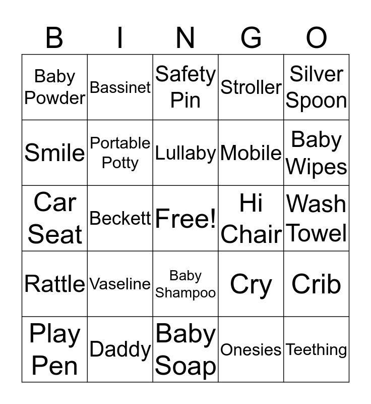 This bingo card has a free space and 24 words: Vaseline, Daddy, Lullaby, Play Pen, Silver Spoon, Baby Powder, Smile, Bassinet, Hi Chair, Baby Shampoo, Mobile, Car Seat, Cry, Crib, Portable Potty, Onesies, Wash Towel, Safety Pin, Baby Wipes, Beckett, Teething, Rattle, Stroller and Baby Soap.
