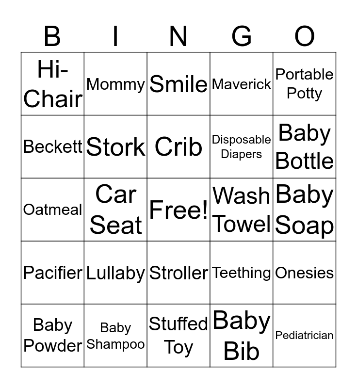 This bingo card has a free space and 48 words: Vaseline, Pediatrician, Breast Feeding, Stuffed Toy, Lullaby, Daddy, Mommy, Holly, Beckett, Jordan, Stork, Maverick, Onesies, Teething, Baby Wipes, Dribbling, Crib, Wash Towel, Rocking Chair, Portable Potty, Car Seat, Baby Bib, Hi-Chair, Disposable Diapers, Rattle, Baby Bottle, Baby Powder, Play Pen, Stroller, Pacifier, Bassinet, Baby Formula, Sleepless Nights, Monitor, Baby Shampoo, Baby Bunting, Safety Pin, Baby Soap, Silver Spoon, Pediatric Nurse, Baby Carriage, Grandma, Smile, Hairbrush, Oatmeal, Mattress Cover, Mobile and Baby Booty.