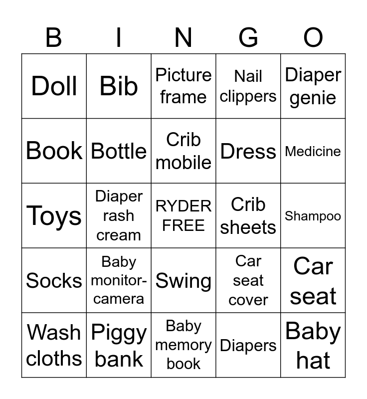 This bingo card has a free space and 52 words: Baby dish,utensils, Baby hat, Baby lotion, Baby memory book, Baby monitor-camera, Bathtub, Bib, Blanket, Book, Booties,shoes, Bottle, Burp cloths, Car seat, Car seat cover, Comb/Brush, Crib, Crib mobile, Crib sheets, Diaper bag, Diaper genie, Diaper rash cream, Diapers, Doll, Dress, Footed sleeper, Gift card, High chair, Hooded towel, Medicine, Mittens, musical soother, Nail clippers, Onsie, Pacifier clip holder, Pack n play, Picture frame, Piggy bank, Play yard, Portable booster seat, Quilt, Receiving blanket, Shampoo, Socks, Stroller, Swing, Teddy bear, Teether, Toys, Tummy time playmat, Walker, Wash cloths and Wipes.