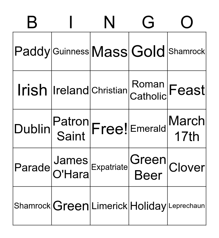 This bingo card has a free space and 28 words: Clover, Rainbow, Roman Catholic, Holiday, Irish, Mass, Guinness, Parade, Emerald, Shamrock, Dublin, Gold, Green, Limerick, Feast, Holy Trinity, James O'Hara, Ireland, Christian, Expatriate, Paddy, Luck, Leprechaun, Patron Saint, March 17th, Green Beer, Shamrock and Corned Beef & Cabbage.