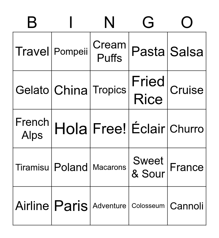 This bingo card has a free space and 37 words: Guacamole, Mexico, Italy, China, France, Poland, Tropics, Tacos, Salsa, Fiesta, Hola, Pasta, Cannoli, Churro, Gelato, Tiramisu, Fried Ice cream, Cream Puffs, Macarons, Éclair, Travel, Cruise, Airline, Adventure, Tour, Colosseum, Pompeii, Leaning Tower of Pisa, Florence, Rome, Eiffel Tower, Paris, French Alps, Cancun, Sweet & Sour, Fried Rice and Chow Mein.