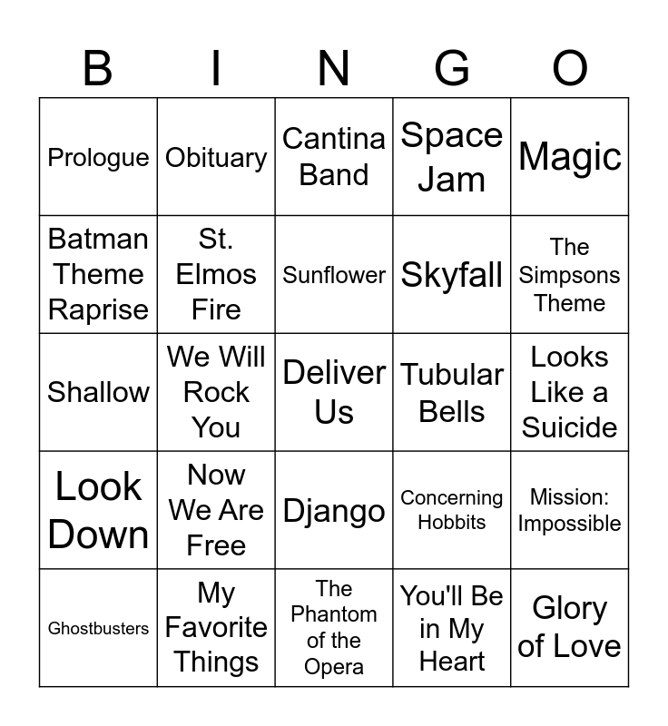 This bingo card has 34 words: Glory of Love, You'll Be in My Heart, If I Can't Have You, Shakedown, Look Down, St. Elmos Fire, Magic, Ghostbusters, Obituary, Lose Yourself, Sunflower, Cantina Band, He's a Pirate, Halloween Theme, Tubular Bells, The Simpsons Theme, My Favorite Things, Shallow, Now We Are Free, Concerning Hobbits, Django, Danger Zone, Prologue, Looks Like a Suicide, The Phantom of the Opera, Deliver Us, Space Jam, The Godfather Waltz, Skyfall, Batman Theme Raprise, Autobots, We Will Rock You, Mission: Impossible and Golden.