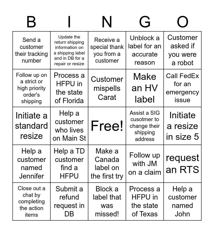 This bingo card has a free space and 24 words: Help a TD customer find a HFPU, Submit a refund request in DB, Customer mispells Carat, Close out a chat by completing the action items, Customer asked if you were a robot, Send a customer their tracking number, Follow up on a strict or high priority order's shipping, Update the return shipping information on a shipping label and in DB for a repair or resize, Assist a SIG cusotmer to change their shipping address, Make a Canada label on the first try, Make an HV label, Initiate a standard resize, Follow up with JM on a claim, request an RTS, Process a HFPU in the state of Florida, Process a HFPU in the state of Texas, Initiate a resize in size 5, Receive a special thank you from a customer, Call FedEx for an emergency issue, Help a customer who lives on Main St, Help a customer named John, Help a customer named Jennifer, Unblock a label for an accurate reason and Block a label that was missed!.