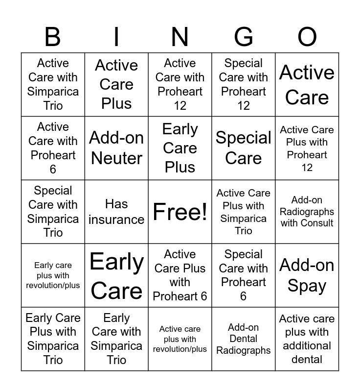 This bingo card has a free space and 24 words: Early Care, Early Care with Simparica Trio, Early Care Plus, Early Care Plus with Simparica Trio, Active Care, Active Care with Simparica Trio, Active Care with Proheart 6, Active Care Plus, Active Care Plus with Simparica Trio, Active Care Plus with Proheart 6, Special Care, Special Care with Simparica Trio, Special Care with Proheart 6, Add-on Spay, Add-on Neuter, Add-on Dental Radiographs, Add-on Radiographs with Consult, Active Care with Proheart 12, Active Care Plus with Proheart 12, Has insurance, Active care plus with additional dental, Early care plus with revolution/plus, Special Care with Proheart 12 and Active care plus with revolution/plus.