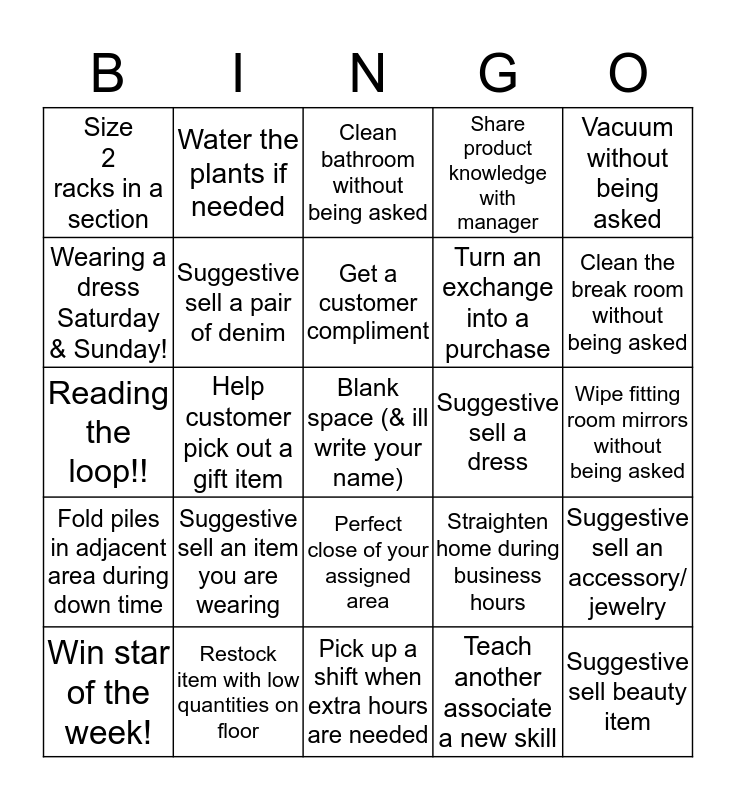 This bingo card has a free space and 24 words: Suggestive sell an item you are wearing, Restock item with low quantities on floor, Get a customer compliment, Win star of the week!, Vacuum without being asked, Size 2 racks in a section, Wearing a dress Saturday & Sunday!, Water the plants if needed, Suggestive sell a dress, Perfect close of your assigned area, Turn an exchange into a purchase, Reading the loop!!, Straighten home during business hours, Suggestive sell an accessory/ jewelry, Suggestive sell a pair of denim, Teach another associate a new skill, Wipe fitting room mirrors without being asked, Clean bathroom without being asked, Clean the break room without being asked, Help customer pick out a gift item, Suggestive sell beauty item, Fold piles in adjacent area during down time, Share product knowledge with manager and Pick up a shift when extra hours are needed.