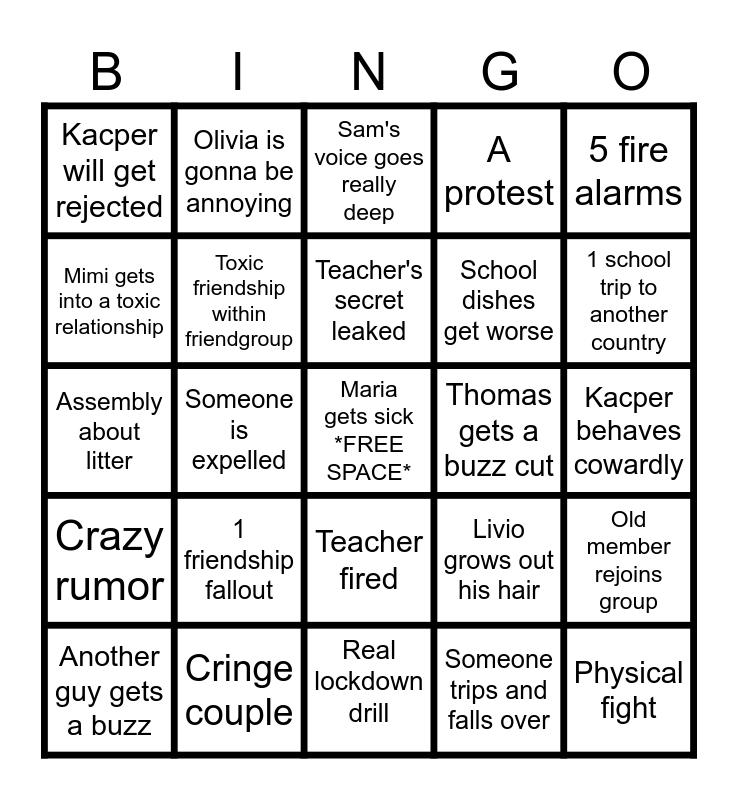 This bingo card has a free space and 24 words: 1 friendship fallout, Cringe couple, Teacher's secret leaked, Another guy gets a buzz, 5 fire alarms, Kacper will get rejected, Mimi gets into a toxic relationship, Olivia is gonna be annoying, Thomas gets a buzz cut, Teacher fired, School dishes get worse, Assembly about litter, Livio grows out his hair, Old member rejoins group, Toxic friendship within friendgroup, Someone trips and falls over, Kacper behaves cowardly, Sam's voice goes really deep, 1 school trip to another country, Someone is expelled, Physical fight, Crazy rumor, A protest and Real lockdown drill.