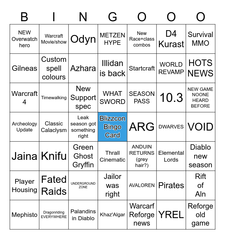 This bingo card has 1 images, a free space and 48 words: AVALOREN, WORLD REVAMP, Khaz'Algar, Classic Calaclysm, New Support spec, VOID, Warcraft Movie/show, Dragonriding EVERYWHERE, D4 Kurast, Thrall Cinematic, Survival MMO, METZEN HYPE, 10.3, SEASON PASS, Player Housing, DWARVES, Gilneas, HOTS NEWS, Pirates, New Race+class combos, Startcraft, Leak season got something right, NEW Overwatch hero, Custom spell colours, Rift of Aln, Azhara, NEW GAME NOONE HEARD BEFORE, Mephisto, WHAT SWORD, Timewalking, YREL, ARG, Diablo new season, Fated Raids, Archeology Update, ANDUIN RETURNS (grey hair?), Elemental Lords, Warcraft 4, Green Ghost Gryffin, UNDERGROUND ZONE, Jaina, Reforge old game, Odyn, Palandins in Diablo, Illidan is back, Jailor was right, Knifu and Warcarf Reforge news.