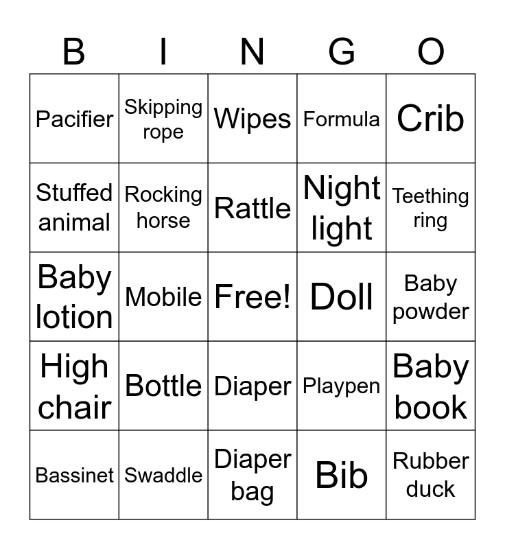 This bingo card has a free space and 24 words: Bottle, Swaddle, Rattle, Bassinet, Crib, Pacifier, Stuffed animal, Skipping rope, Doll, Diaper, Night light, Baby lotion, Playpen, Baby book, Rocking horse, Bib, Baby powder, Wipes, Teething ring, Mobile, Rubber duck, High chair, Formula and Diaper bag.